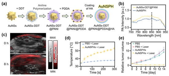 Metallic nanoparticles have received considerable attention because of their relative ease of tuning optical responses. Recently, Wang et al. introduced gold-based nanocomposites, named AuNSPHs, that exhibited high photothermal conversion efficiency []. AuNSPHs were based on gold nanostars (AuNSs) coated with polyaniline (PANI) using 1-dodecylmercaptan (DDT) as a linker (Figure 5a). To add targeting ability to tumors, hyaluronic acid coating was applied through electrostatic interactions with poly(diallyldimethylammonium chloride) (PDDA). The resulting AuNSPHs showed up to 78.6% photothermal conversion efficiency and strong PA signal generation at 850 nm (Figure 5b). For in vivo evaluation, PA images of 4T1 tumor-bearing mice were analyzed after the intravenous injection of AuNSPHs (Figure 5c). After 8 h of injection, the PA signals in the tumor region increased 2.3 times, showing an accumulation in AuNSPHs. Under 808 nm laser illumination, the temperature increased by 18.9 °C in the AuNSPH-delivered site, whereas only 3.7 °C was increased in the control group (Figure 5d). The relative tumor volume after PTT also showed the treatment efficacy of AuNSPHs (Figure 5e). Based on their outstanding photothermal conversion efficiency (78.6%), AuNSPHs can be potentially used as theranostic agents.