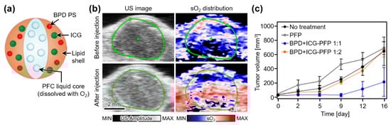 Xavierselwan et al. also demonstrated theranostic perfluoropentane (PFP) nanodroplets that can carry three agents, i.e., benzoporphyrin derivative photosensitizer (BPD), indocyanine green (ICG), and oxygen (Figure 6a) []. Under laser illumination, ICG absorbs light energy and initiates the vaporization of PFP nanodroplets, which release oxygen. Therefore, the developed droplets can be used as light-triggering drug delivery platforms. To test the ability of PDT, the treatment laser beam (690 nm, 150 mW/cm2) was irradiated on FaDu xenografts in mice after the tail vein injection of the PFP droplets. Multispectral PAI verified the oxygen release at the tumor site by measuring a ~9.1-fold increase in the oxygen saturation level (Figure 6b). After PDT, the tumor growth was successfully suppressed by the nanodroplets (Figure 6c). Tumor prognosis showed that PFP containing BPD and ICG at a ratio of 1:1 efficiently performed PDT.