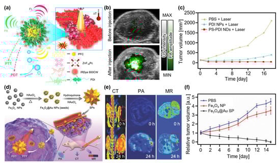 Organic materials are widely used for contrast-enhanced PAI because of their good photostability and nontoxicity. Organic semiconductor polymers have been studied for PA-guided PTT by tuning their optical absorption characteristics. Chen et al. demonstrated NIR-absorbing semiconductor polymer nanoparticles for both contrast-enhanced PAI and PTT []. The developed polymers were synthesized with different molecular weights based on diketopyrrolopyrrole–dithiophenes (DPP-DTs), the sizes of which could be tuned by controlling the concentrations of the initial polymers (Figure 3a). Remarkably, the absorption peak of DDP-DT red-shifted with an increase in the particle size (Figure 3b). The results showed the potential of DDP-DTs for multispectral PAI with broadly tunable absorption peaks (630–811 nm) by adjusting the particle size. Moreover, DDP-DTs were PEGylated with carboxyl groups (PS-PEG-COOH) to function as PTT agents (Figure 3c). The encapsulated semiconductor polymer dots (DPP-DT Pdots) were delivered into H22 hepatocellular tumor-bearing mice, and PA images were obtained at an excitation wavelength of 808 nm (Figure 3d). The resulting images showed contrast enhancement (a 2.6-fold increase compared to the control group) in the tumor, verifying the accumulation of DPP-DT Pdots. The PTT efficiency was also evaluated by measuring the temperature increase under laser illumination at the tumor site (Figure 3e). The temperature was increased by 26 °C within 5 min in the DPP-DT-Pdot group, whereas insignificant temperature increases were observed in the control groups. Furthermore, when comparing the tumor volumes, the prognosis in the PTT-treated group with DPP-DT Pdots showed a significant therapeutic ability compared to the other groups (Figure 3f).
