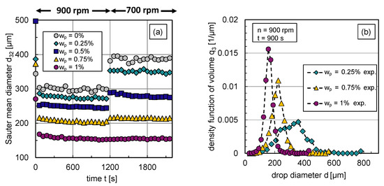 - Röhl, S.; Hohl, L.; Kempin, M.; Enders, F.; Jurtz, N.; Kraume, M. Influence of different Silica nanoparticles on drop size distributions in agitated liquid–liquid systems. Chem. Ing. Tech. 2019, 91, 1640–1655. [Google Scholar] [CrossRef]