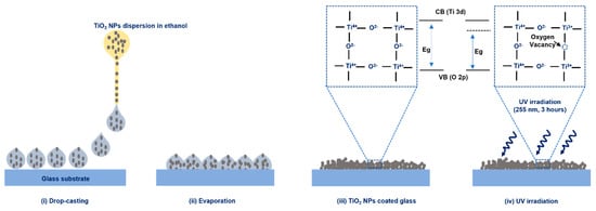 The TiO2 nanoparticles (<25 nm, 99.5%, Sigma Aldrich, USA) were mixed with ethanol to obtain a concentration of 5 mg/L using a magnetic stirrer. The stirring lasted 30 min at 500 rpm, while the drop-casting technique was employed for applying TiO2-nanoparticles dispersion on a glass substrate. The glass substrate was subsequently placed on a hot plate at a temperature of 80 degrees Celsius for ethanol removal. This eventually produced a solid film of TiO2 nanoparticles on the glass substrate. Two different substrates were synthesized using aforementioned experimental conditions, while one substrate with solid TiO2 nanoparticles was exposed to UV radiation of 255 nm at a distance of 15 cm from a 6-watt UV lamp (UVP UVGL, Analytik Jena, Germany) while the second substrate was not treated with UV exposure. The schematic diagram illustrates the processes and an experimental procedure is presented in Figure 1.