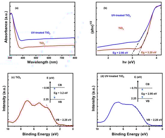 The bandgap and optical absorption of the readymade TiO2 film in its primal and UV-irradiated state were investigated via UV-Vis diffuse-reflectance spectroscopy. From this analysis, it was observed that the UV-treated TiO2 films had a higher absorption in the visible region than the untreated TiO2 films (Figure 2a). In terms of the bandgap energy, the UV-treated TiO2 films demonstrated a narrower bandgap of approximately 2.95 eV, compared to the 3.2 eV observed in the untreated TiO2 films (Figure 2b). Valence-band energy can be obtained from XPS valance-band spectra through extrapolation to the binding-energy axis. The energy of a valence band is the energy of the band of electron orbitals with which electrons jump out (and move into the conduction band) when excited. The determination of the valence-band energy from the acquired XPS valence-band spectra is presented in Figure 2c,d. The valence-band energy of the TiO2 that was not exposed to UV radiation is presented in Figure 2c, while that of the TiO2 sample subjected to UV radiation for possible oxygen-vacancy creation is presented in Figure 2d. The valence-band energy for both the UV-treated and the untreated TiO2 film had a similar value because the top of the valence band was governed by the O 2p states, while the bottom of the conduction band was controlled by the Ti 3d state. Therefore, a defect (in Ti3+) that formed just below the conduction band was responsible for the variation in the conduction-band energy for the UV-treated and untreated TiO2 films. Hence, the UV-treated sample was characterized by a reduced/narrow energy gap after the UV exposure.