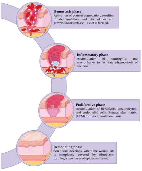 Wound healing is a dynamic and complex process initiated when tissue integrity is compromised. It is characterized by a sequence of orchestrated phases (Figure 1): hemostasis, inflammation, cellular migration, and proliferation, protein synthesis, wound contraction, and remodeling, which involves the recruitment of several soluble mediators, extracellular matrix (ECM) components, and parenchymal cells [1,2,3,4,5,6,7,8]. However, only three phases are distinguished: inflammation, proliferation, and remodeling, since an overlap of phases usually occurs [8,9,10].