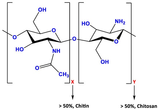 Chitosan, a linear biopolymer extracted from N-acetylated chitin, is a cationic polysaccharide containing copolymers of glucosamine. Its molecular structure (Figure 2) comprises a linear backbone linked through glycosidic bonds with a random copolymer of β-(1–4)-linked D-glucosamine and N-acetyl-D-glucosamine [19,20,21,22]. Although it is a weak base insoluble in water, it becomes soluble in aqueous acidic media [21,23]. Its insolubility in neutral or basic solutions occurs due to its slightly crystalline character. However, an acidic environment enables the free amino groups of chitosan to become protonated. The high positive charge of chitosan allows the formation of a polyelectrolyte complex hydrogel with polyanionic species in an acidic environment [24].