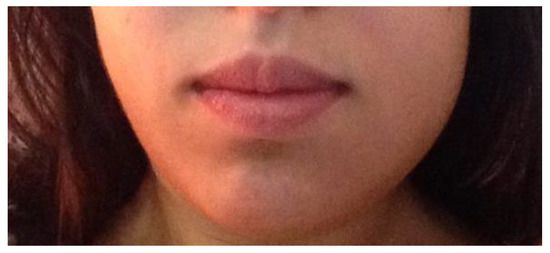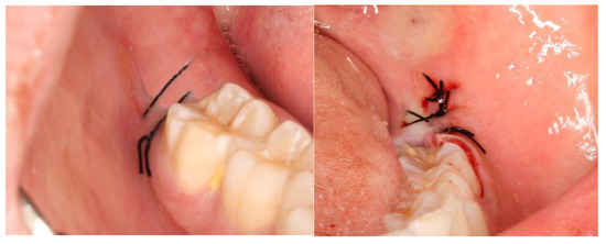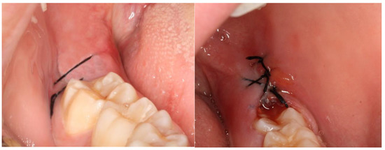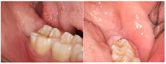 Following surgery, all patients were prescribed an antibiotic, analgesic, and NSAID (amoxicillin and clavulanic acid, paracetamol, and Ibuprofen) [42,43]. Corticosteroid (Deflazacort) was prescribed only if osteotomy was performed. One week after the procedure, the sutures were removed. The healing process was assessed by an analysis of inflammation signs (redness, swelling, pain, and loss of function) and bleeding from the post-extraction sockets. These factors were subjected to a semi-quantitative analysis. Notably, the evaluation of these variables is purely subjective. The initial color of the oral mucosa (Figure 3) and the shape of the face/mandibular angle (Figure 4) were examined to evaluate preoperative and postoperative redness and swelling, respectively. Loss of function was assessed by the presence or absence of trismus. A questionnaire was also conducted to monitor the postoperative symptoms and medication. In turn, pain intensity was evaluated through a Visual Analogue Scale (VAS) [44].