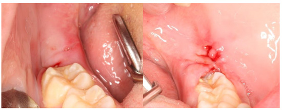 A case example of a patient’s follow-up, 72 h post-surgery. On the left, the result of tooth extraction where chitosan was applied to the socket; on the right, the side subjected to surgery with chitosan application.