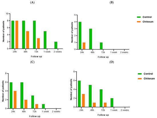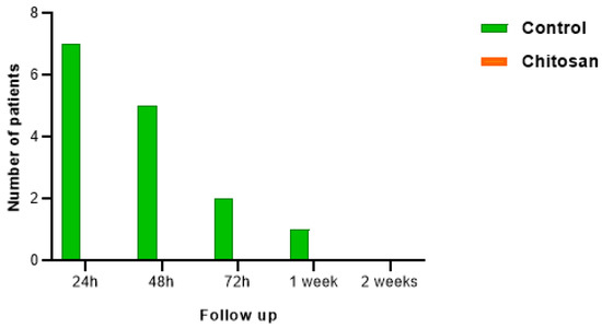 According to the redness data analysis (Figure 10), all patients showed redness in the surgical area 24 h after each surgery. The differences begin to emerge in the next days of follow-up. In the control cases, all patients exhibited redness at 48 h and 72 h. One week after surgery, the percentage of patients with redness decreased to 62.5% and in the second week to 25%. In surgeries where chitosan was applied, a progressive decrease in the percentage of patients with redness was observed: after 48 h and 72 h, the percentage was 62.5% and 37.5%, respectively. The surgery region showed no redness a week later. After 2 weeks of follow up, the visual result of healing of the oral tissue was similar in both cases. These findings can be explained by chitosan’s capacity to actively participate in the early phase of wound healing and increase angiogenesis. In other words, chitosan attracts and activates neutrophils and macrophages and enhances the expression of cytokines and growth factors [7,24], as well as promoting wound healing by stimulating granulation tissue formation or re-epithelialization [7].