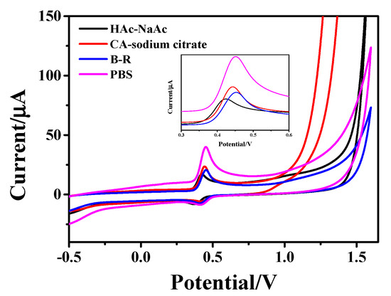 CV curves of 1 × 10−4 M AC on Fe3O4-rGO/GCE electrodes at a scan rate of 100 mV·s−1 in different buffer solutions: PBS (pH = 5.6), B-R (pH = 5.0), CA-sodium citrate (pH = 5.0) and Hac-NaAc (pH = 5.5).