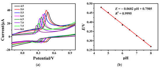 In the optimal buffer solution of PBS, the effect of solution pH on the peak current value of AC oxidation was further tested. The CV curves of AC on Fe3O4-rGO/GCE electrodes in PBS buffer solution with different pHs of 4.5, 5.0, 5.5, 6.0, 6.5, 7.0, 7.5, and 8.0 are depicted in Figure 5a. It is obvious from Figure 5a that the oxidation peak increases significantly with the pH of PBS increasing from 4.5 to 5.0. The current peak reaches its maximum at pH 5. When the pH value increases from 5.0 to 8.0, the current peak decreases rapidly. Additionally, the redox peaks shift towards negative potentials with increasing pH, indicating a strong dependence of the redox reaction on buffer pH value. The formal potential (E) is the average value of the oxidation peak and reduction peak and is plotted in Figure 5b as a function of pH. As can be clearly seen, with the increase in buffer pH, the potential corresponding to the highest point of the peak begins to shift negatively, and there is a good linear relationship between the pH value of PBS and the peak potential. The linear equation is: E = −0.0602 pH + 0.7505 (R2 = 0.9995). Since both sodium and disodium phosphate can exchange protons during ionization and hydrolysis, the electrode reaction involves protons. Changes in pH directly affect the degree of ionization or hydrolysis of H2PO4− and HPO42−. In order to obtain high sensitivity and an electrical signal, PBS buffer with pH 5.0 was finally selected as an electrolyte [47,48].