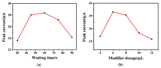 Relationship between (a) waiting time and (b) modifier dosage and oxidation peak current obtained by 1 × 10−4 M AC on Fe3O4-rGO/GCE electrodes at a scan rate of 100 mV·s−1 in PBS buffer solution (pH = 5.0).