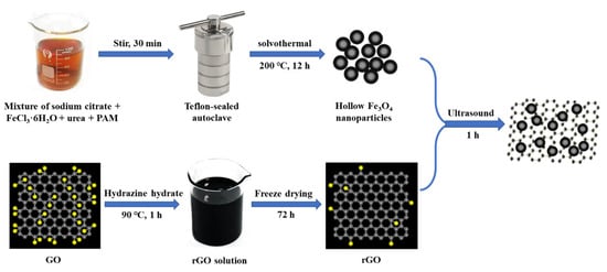 In recent research, nanocomposites were used in electrochemical applications, including as sensors, owing to their high surface area, high conductivity, and good electrocatalytic properties [3,16,17,18,19,20,21]. More recently, magnetic Fe3O4 nanoparticles have shown excellent magnetic properties, electrical conductivity, chemical stability, biocompatibility, and low toxicity. Therefore, Fe3O4 nanoparticles have received increasing attention as potential electrode modification materials or have been widely applied in electrochemical sensors and biosensors [22,23,24,25]. In addition, magnetic Fe3O4 nanoparticles with hollow structures can provide a larger electrochemically active area [26,27]. To further increase their electrochemically active area, hollow Fe3O4 nanoparticles were combined with reduced graphene oxide (rGO). Reduced graphene oxide consists of a layer of sp2-bonded carbon atoms that act as electron donor groups, thus exhibiting excellent electrical conductivity, large electrochemically active areas, and good chemical stability, and can be used as a high-quality conductor and carrier [3,28,29,30,31,32].