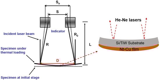 During the annealing process, thermal stress was determined by measuring the curvature change of the films. A sampling rate of 0.05 Hz was set to record the curvature changes. It was due to the CTE mismatch of the silicon substrate and Cu film. The thermal-stress measurements were entirely carried out in a home-built bending beam system, as shown in Figure 1. The films were heated to 200 °C in a vacuum (8 × 10−3 torr) at a heating rate of 5 °C/min. In the semiconductor industry, a processing temperature below 200 °C is favorable and highly recommended for chip packaging. A higher annealing temperature may be detrimental to other electronic components. In fact, we aimed to imitate the actual processes in advanced packaging and to address the stress relaxation and grain growth behaviors of such Cu films during thermal processing. The thermal behaviors of the films under different annealing temperatures could be an interesting topic for further investigation. The temperature was then held for 10 h and naturally cooled down to room temperature. The average in-plane stress in the films was determined using Stoney’s Equation [52,53,54],