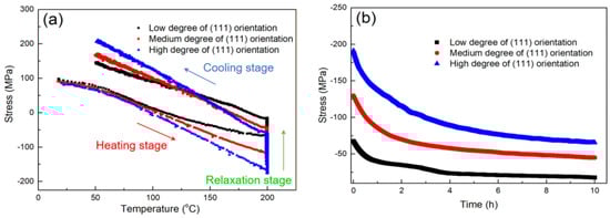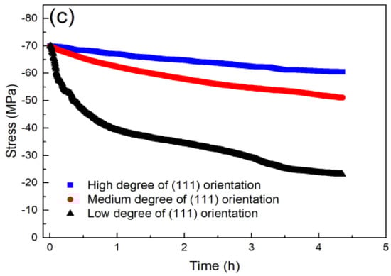 In this study, the thermal-stress behaviors of the nt-Cu films were characterized using a bending beam system in a vacuum. They were heated at a heating rate of 5 °C/min to 200 °C and the temperature was then maintained for 10 h to study the stress relaxation of the films. Finally, the films were slowly cooled down to room temperature. During such annealing, the induced thermal stress of the films was recorded by measuring the curvatures of the films. Figure 4a shows the thermal-stress behaviors of the nt-Cu films with different degrees of (111) orientation. As the temperature increased, the tensile stress converted to compressive stress because of the CTE mismatch. The compressive stress reached a maximum value at the beginning of the annealing (200 °C). During the annealing, it gradually relaxed to nearly zero. As the sample cooled down, it transformed to a greater tensile stress compared to its initial state. During the temperature changes, the stress relaxation was dominated by the interaction between the plastic flow and grain boundary diffusion [61]. It resulted from the minimization processes of the defect/twin/strain and interface energies [62]. We found that, under the annealing process, the nt-Cu films with a higher degree of (111) orientation exhibited a greater range of thermal stress. Their nanotwin structures with superior mechanical properties could withstand higher compressive and tensile stresses and store a larger amount of strain energy. Under a high annealing temperature, the nanotwins could stabilize the Cu microstructure and store more thermal stress. Thus, grain growth could only occur at high temperatures. The relaxation behavior of thermal stress versus time is shown in Figure 4b. It was found that the nt-Cu films with higher degrees of (111)-preferred orientation reached its stable state slower than the lower ones. In order to avoid the difference in the deformation mechanism in relaxation with different stress levels, we compared the relaxation from the same stress level. As shown in Figure 4c, the nt-Cu films with highly (111)-preferred orientation apparently exhibited less stress relaxation.