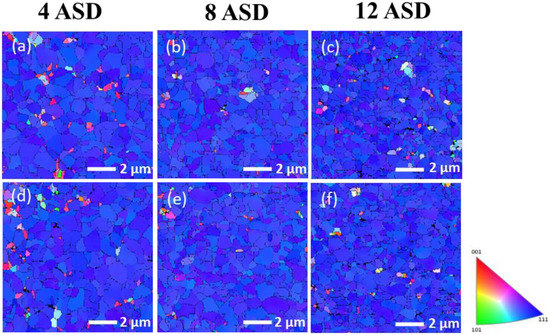Top-view EBSD images of the as-fabricated (a–c) and annealed (d–f) nt-Cu films deposited with various current densities of 4, 8, and 12 ASD, respectively. The nt-Cu films were electrodeposited at 25 °C and the annealing was conducted at 200 °C for 10 h.