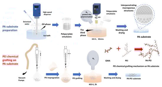 A certain amount of PA substrate was placed in a round-bottom flask with a pressure-equalizing funnel with double PTFE stopcocks attached to the upper end. The PA substrate was treated under vacuum at 393 K for 2 h. PEI and methanol were dissolved well by sonication at a mass ratio of 4:1 and then transferred into the round-bottom flask under vacuum. After complete impregnation, the reaction was carried out in nitrogen atmosphere at 403 K for 2 h. The modified material (PA-PEI) was obtained by being washed with water to neutral, soaked in ethanol for 12 h, and dried in an oven at 343 K to constant weight. The reaction process of the synthesis of PA and PA-PEI is shown in Figure 1.