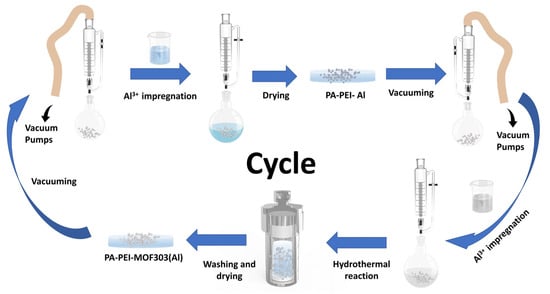 PA-PEI was placed in a round-bottom flask with a pressure-equalizing funnel with double PTFE stopcocks attached to the upper end and treated under vacuum at 393 K for 2 h. A 1.08 M metal salt solution was prepared by dissolving 5.2 g aluminum chloride hexahydrate in 20 mL deionized water. Then the metal salt solution was added to the round-bottom flask under vacuum and sonicated for 5 min. After aging for 24 h, the salt solution was filtered out. The PA-PEI-Al modified substrates were obtained by being dried in an oven at 343 K until constant weight. Similarly, the PA-PEI-Al material was vacuum-treated at 393 K for 2 h. An amount of 1.1 g of 3, 5-pyrazole dicarboxylic acid monohydrate was dissolved in 30 mL of deionized water, then 3 mL of sodium hydroxide solution (2.57 M) was added and sonicated until the ligand was well dissolved to prepare 0.19 M ligand solution. The ligand solution was then added to a round-bottom flask containing a PA-PEI-Al substrate under vacuum and sonicated for 5 min. Subsequently, the matrix and ligand solution were all transferred to a Teflon-lined autoclave reaction kettle and reacted at 373 K for 24 h. After the system was cooled to room temperature, the composite was washed with methanol using a Soxhlet extraction device for 24 h and dried under vacuum at 343 K for 24 h. As shown in Figure 2, PEI-PA-MOF303(Al) composite was prepared through five times of impregnation and regrowth processes.