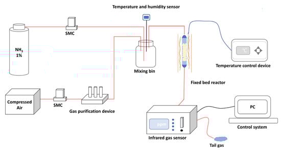 The breakthrough experiments were used to evaluate NH3 dynamic adsorption performance. The self-constructed NH3 dynamic adsorption evaluation system is shown in Figure 3. Dynamic adsorption performances of the prepared materials were evaluated in a vertical fixed bed reactor with a quartz tube of 8 mm inner diameter. The materials with height of 8 cm were loaded into the quartz tube and the experiment temperature was 298 K. The reaction gas of 500 ppm NH3 was generated by mixing cylinder gas (1% NH3, 99% N2) with the purified compressed air (relative humidity < 5%) at a total gas flow rate of 0.1 L·min−1. An infrared gas detector (Beijing BAIF-Maihak Analytical Instruments Co., Ltd., QGS-08C, Beijing, China) was used for online analysis. The materials were heated at 423 K under vacuum for 2 h before the breakthrough experiments. For the cyclic adsorption-desorption experiment, the regenerated materials were obtained by heating the saturated adsorbent materials at 423 K for 2 h under vacuum conditions.