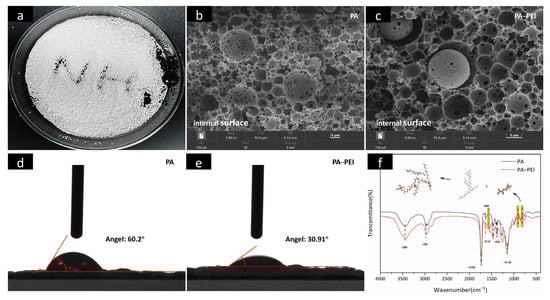 An optical picture and internal surface images of the porous PA polymer substrate prepared by emulsion polymerization are shown in Figure 4a,b. The porous PA polymer substrate is almost spherical and has spherical pores with 2–20 μm interpenetrating macropores [,]. Obviously, the pore structure of PA did not change (Figure 4c), but the hydrophilicity changed after PEI modification (Figure 4d,e). The increase in hydrophilicity caused by modifying the PA with PEI favored subsequent mass transfer of MOFs from a solution that entered the pore channels. The FTIR spectra of the PA substrate before and after modification are shown in Figure 4f. In the spectrum of PA, the typical C=O stretching vibration peak of polyacrylate at 1732 cm−1 is present []. The three characteristic peaks assigned to tert-butyl methacrylate, –CH stretching vibration, and the –CH2 shear vibration appear at 1734 cm−1, 2975 cm−1, and 1467 cm−1, respectively [,]. While peaks at 905 and 804 cm−1 were assigned to vibrations of the skeletons of ternary ring ethers in glycidyl methacrylate []. Obviously, the cyclic ether skeleton vibration peak of the PA-PEI substrate was significantly weaker than that of the PA substrate, indicating that the cyclic ether structure was disrupted in the PA-PEI substrate. There is a peak at 1566 cm−1 in the PA-PEI substrate, which was designated as N–H bending vibration, indicating that the PEI had been successfully grafted onto the PA substrate [].