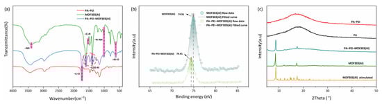 FTIR spectra (a), XPS spectra (b), and XRD patterns of PA, PA-PEI, MOF303(Al), and PA-PEI-MOF303(Al) (c).