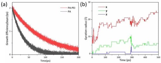 (a) Growth efficiency simulation of MOF303(Al) on PA and PA-PEI surface; (b) gyration radius of MOF303(Al) on PA-PEI substrates.