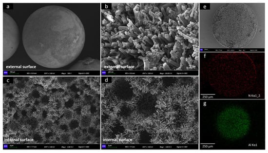 The PA-PEI-MOF303(Al) composite surface and interior morphologies are clearly shown in Figure 7. The loading rate of MOF303(Al) is 51.15 wt% (Table S1). Unlike other spherical MOF/polymer composites, the PA-PEI-MOF303(Al) composite had a good degree of sphericity (Figure 7a) and a low density of 0.35 g·cm−3 (Table S1), and could be mass-produced []. The particle diameters of a PA-PEI-MOF303(Al) ball were nearly 0.6–1 mm. MOF303(Al) formed uniform and dense 0.5–3 μm-long cuboid-like crystal clusters on the PA-PEI substrate surfaces (Figure 7b) and in the internal pore channels (Figure 7c,d), and formed a multi-level pore structure that allowed gas diffusion and mass transfer to the surface and within the composite structure. The EDS maps shown in Figure 7e–g indicated that Al and N were uniformly distributed through the cross-section of the material.