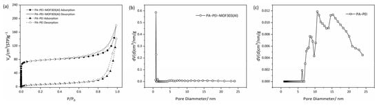 (a) N2 adsorption-desorption isotherms and (b,c) pore size distribution curves of (b) PA-PEI-MOF303(Al) and (c) PA-PEI.