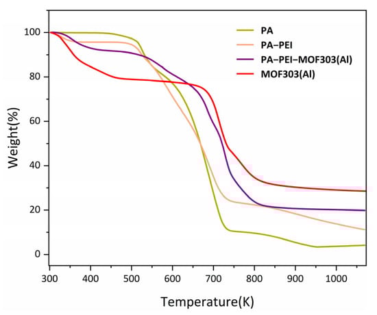 The stability of a material is an important indicator of the ability of the material to be used in any particular application. The thermal stabilities of the PA, PA-PEI, MOF303(Al), and PA-PEI-MOF303(Al) were determined by thermogravimetry, and the results are shown in Figure 9. The PA substrate lost mass slowly at 473 K, which corresponds to the thermal decomposition of the residual components not involved in the polymerization, while the second thermal weight loss after 673 K belongs to the degradation of the polymer substrate. There was a mass loss of about 4% in the PA-PEI substrate from 298 to 373 K. This is because PA-PEI had adsorbed gases such as carbon dioxide and moisture from the air. Subsequently, the PA-PEI substrate decomposed at 473 K []. At 293 to 373 K, MOF303(Al) had a small mass loss, which was attributed to the loss of residual solvent in the pores []. The PA-PEI-MOF303(Al) composite had a slow mass loss up to 673 K, which was the same as the mass loss of the substrate and MOF303(Al).