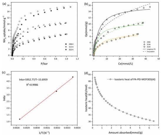 We fitted Langmuir and Freundlich adsorption isotherms to the data, as shown in Figure 10b, and the fitting results are shown in Table 3. The nonlinear fits were good for both the Langmuir and Freundlich equations, the correlation coefficients R2 being >0.96. The maximum adsorption equilibrium capacity  determined using the Langmuir model was 16.07 mmol·g−1 at 298 K, and the adsorption equilibrium capacity at 313 and 353 K were 10.53·g−1 and 7.28 mmol·g−1, respectively. The adsorption equilibrium capacity decreased as the temperature increased. The Langmuir constants  were all between 0 and 1, and the Freundlich equation gave 0.1 <  < 0.5, indicating that adsorption of NH3 was favorable at <353 K []. The Langmuir constant  increased and then decreased as the temperature increased. In a certain temperature range, increasing the temperature could generate new adsorption sites and increase chemical interactions between NH3 and the PA-PEI-MOF303(Al) composite, resulting first in the increase and then in the decrease of the NH3 adsorption rate [].