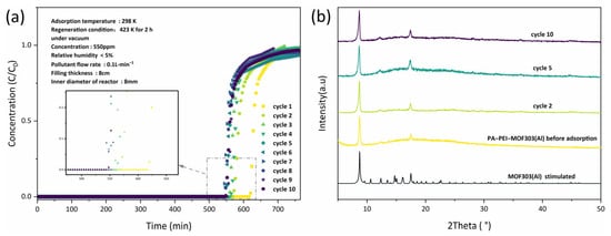 NH3 dynamic adsorption experiments were performed by breakthrough tests and the reversibility of NH3 adsorption by PA-PEI-MOF303(Al) was evaluated. As shown in Figure 11a, the PA-PEI-MOF303(Al) composite had an excellent adsorption capacity for NH3, and NH3 started to break through at 620 min for the first adsorption. As the number of regenerations increases, the breakthrough time decreases. The breakthrough time decreased by approximately 10% after the composite had been regenerated twice and it nearly had no change from two to ten regenerations. This was due to the existence of chemisorption between a small amount of ammonia gas and the composite material during chemisorption. Under the regeneration conditions of 423 K in vacuum, there existed a small amount of ammonia gas based on chemisorption that was difficult to remove. Then, the XRD of PA-PEI-MOF-303(Al) composite after NH3 adsorption was taken to examine the stability of the composite (Figure 11b). The XRD indicated that no significant changes in the crystalline structure of the PA-PEI-MOF303(Al) composite occurred after various numbers of NH3 adsorption-regeneration cycles at the same relative humidity. This indicated that the PA-PEI-MOF303(Al) composite had good stability for regeneration and could be reused multiple times.