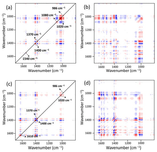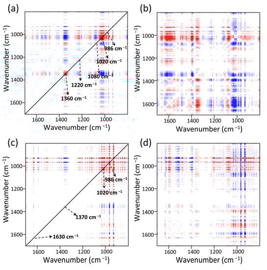 NH3 adsorption stage: (a,b) synchronous (a) and asynchronous (b) 2DCOS-FTIR maps of MOF303(Al); (c,d) synchronous (c) and asynchronous (d) 2DCOS-FTIR maps of PA-PEI-MOF303(Al). Red represents positive correlations and blue represents negative correlations; a higher color intensity indicates a stronger positive or negative correlation.