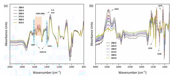 The diagrams shown in Figure 14a,b indicated that the MOF303(Al) and PA-PEI-MOF303(Al) groups changed markedly during heating-desorption. For example, the peak for stretching vibrations of COO– in the MOF303(Al) at 1414 cm−1 and a characteristic peak shift for nitrogen heterocycles (e.g., the pyrazole ring) clearly changed. This would have been caused by the high temperature causing NH3 desorption and destroying COO–(Al–O) clusters and hydrogen bonds between N–N and NH3 []. The position shifts and intensity changes for the N–H and C–N bands at 1500–1600 cm−1 indicated that the structures mentioned above may also have been NH3 adsorption sites. The relative intensities of the peaks related to hydroxyl groups and hydrogen bonds (3424 and 1079 cm−1) in PA-PEI-MOF303(Al) were also strongly decreased by heating. The loss of NH3 from PA-PEI-MOF303(Al) caused marked changes in intermolecular hydrogen bonds, particularly the disappearance of the characteristic NH3 peaks at 1230 and 1354 cm−1, and this was strong proof for efficient NH3 loss []. However, this could be attributed to changes in interactions between the host and guest at high temperatures, but the spectral characteristics did not change markedly, indicating that the material did not decompose at 423 K.