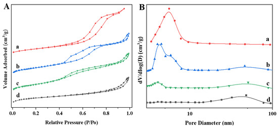 (A) N2 adsorption–desorption isotherms, (B) pore size distribution curves. (a) M-Al2O3; (b) 3DOMM-Al2O3; (c) PtSn/3DOMM-Al2O3; (d) 3DOM-Al2O3.