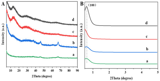 Wide- and low-angle XRD patterns (A,B). (a) 3DOMM-Al2O3; (b) PtSn/3DOMM-Al2O3; (c) PtSn/3DOM-Al2O3; (d) PtSn/M-Al2O3.