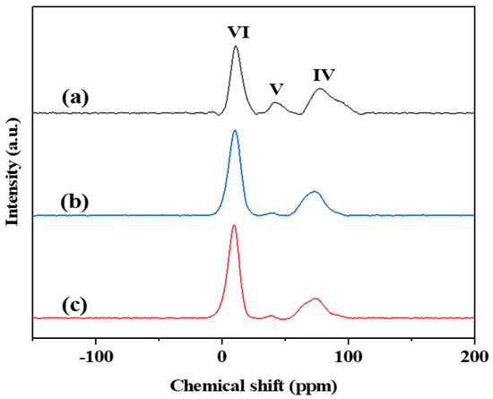 To perform an in-depth investigation of the surface characteristics of the Al2O3 support, solid-state 27Al NMR techniques were employed. Figure 5 exhibits the NMR spectra of the PtSn/Al2O3 catalysts. Three resonance signals were observed at 73, 44, and 9 ppm, which were assigned to the Al3+ ion in the tetra-coordinated (AlO4), penta-coordinated (AlO5), and hexa-coordinated (AlO6) coordination, respectively [29]. Penta-coordinated AlO5 is universally acknowledged to be the site for anchoring metal sites due to its coordination of unsaturated properties. For Pt/γ-Al2O3 catalysts, coordination unsaturated penta-coordination (AlO5) is the main site for stabilizing Pt [30]. The PtSn/3DOMM-Al2O3 catalyst has a much greater proportion of penta-coordinated Al3+ ions on its surface than both the PtSn/M-Al2O3 and PtSn/3DOM-Al2O3 catalysts. In addition, the proportions of Al3+ ions with different coordination sites are exhibited in Table 1. The PtSn/3DOMM-Al2O3 catalyst has the highest fraction of penta-coordinated Al3+ ions at 9%, while the PtSn/M-Al2O3 and PtSn/3DOM-Al2O3 catalysts have only about 1%. The penta-coordinated Al3+ ion sites on the PtSn/3DOMM-Al2O3 catalyst can enhance the anchoring interaction between γ-Al2O3 and Pt, which avoids the aggregation of nanoparticles and improves the stability.