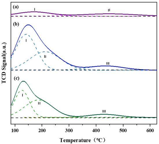 NH3-TPD patterns of the PtSn/γ-Al2O3: (a) PtSn/3DOM-Al2O3; (b) PtSn/M-Al2O3; (c) PtSn/3DOMM-Al2O3.