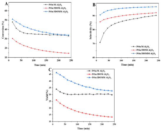 The catalytic performances of the PtSn/γ-Al2O3 catalyst are shown in Figure 10A,B, which shows changes in conversion and selectivity with operating time, respectively. Among all the PtSn/Al2O3 catalysts, the PtSn/3DOMM-Al2O3 catalyst shows the most desired catalytic performance. The initial conversion rate of 51.0% reduced to a conversion rate of 33.9% after 4 h of reaction, and the selectivity increased from 90.7% to 96.5%. The PtSn/M-Al2O3 catalyst reveals a high initial conversion rate of propane (47.9%) but a low initial selectivity of propylene (initial: 70.9%), and it quickly deactivates within the first hour. However, the conversion rate dropped to 33.0% after 4 h, while the selectivity of propylene gradually increased (final: 90.3%). Although the conversion rate of PtSn/3DOM-Al2O3 is the lowest (initial: 30.4%, final: 14.5%), its selectivity (initial: 85.7%, final 92.3%) is higher than that of PtSn/M-Al2O3. This phenomenon can be explained by the volcanic curve relationship between selectivity and conversion in a PDH reaction [41]. Compared with PtSn/γ-Al2O3 catalysts with other porous structures, the hierarchical macro-mesoporous PtSn/3DOMM-Al2O3 catalyst has a higher conversion, selectivity, and strong stability. As shown in Figure 10C, it is also obvious that the PtSn/3DOMM-Al2O3 catalyst possesses the highest propylene yield, followed by PtSn/M-Al2O3, and the PtSn/3DOM-Al2O3 catalysts have the lowest yield during a 4 h reaction test. The PtSn/3DOMM-Al2O3 catalyst displays better comprehensive conversion and selectivity than the PtSn/M-Al2O3 and PtSn/3DOM-Al2O3 catalysts. In addition, the catalytic performance of the PtSn/3DOMM-Al2O3 catalyst was compared with that of Pt-based catalysts reported recently. As shown in Table S1, the PtSn/3DOMM-Al2O3 catalyst has high conversion and selectivity, indicating that it has a good prospect for industrial PDH application.