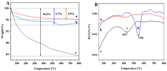 TG (A) and DTG (B) patterns of the PtSn/Al2O3 catalysts: (a) PtSn/3DOM-Al2O3; (b) PtSn/3DOMM-Al2O3; (c) PtSn/M-Al2O3.
