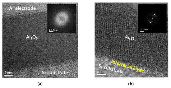 PMA was performed at 400 °C for 30 min after Al2O3 film deposition. After PMA on the Al2O3 film, oxygen in the dielectric film diffused toward the Si substrate. Accordingly, Si and oxygen form a bond in the SiOX (x = 1–2) state, thereby forming an IL with a thickness of 2.5 nm [8,17] (Figure 2b). As IL was formed between Al2O3 and Si, the thickness of Al2O3 decreased from 28.7 to 26.9 nm after PMA. Furthermore, as shown in SADP, amorphous Al2O3 is converted to polycrystalline Al2O3 via PMA [18].