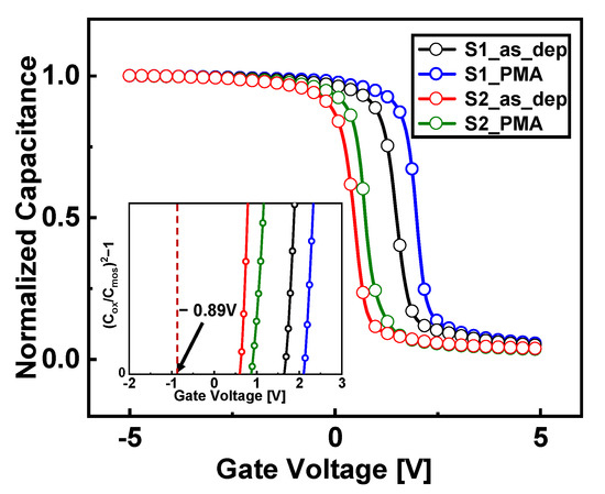 The normalized capacitance vs. voltage curves before and after PMA of S1 and S2 are shown in Figure 3. The graphical ((COX/CMOS)2 − 1)(VG) method [19] was applied to the normalized capacitance vs. voltage curve to extract Vfb. The Vfb of as-deposited S1 was 1.65 V, showing a considerable flat-band voltage shift (ΔVfb ≈ 2.54 V) compared with the theoretical value of Al2O3 dielectric (Vfb ≈ −0.89 V). This Vfb shift resulted from defects, such as carbon impurities that occur during Al2O3 deposition via PEALD. However, in the case of S2 samples with an increased O2 plasma exposure time, the Vfb of S2_as_dep is 0.61 V, exhibiting a smaller ΔVfb compared with that of S1. This is because the amount of negatively charged defects inside S2 is smaller than that of S1.