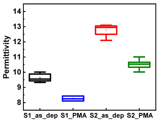 The permittivity of Al2O3 samples before and after PMA is shown in Figure 4. The permittivity is 9.5 in the case of the as-deposited S1 sample, which is similar to the generally known permittivity value of amorphous Al2O3 (6–9) [18,20]. However, an IL of SiOX (x = 1–2) is formed between Al2O3 and Si after PMA, slightly decreasing the permittivity. The permittivity of the as-deposited S2 sample is 12.5, which is considerably higher than that of the S1 sample. This is because of the decrease in the content of various defects and the increase in the internal carbon concentration owing to the longer O2 plasma exposure time. After PMA on the as-deposited S2 sample, the permittivity decreases to 10.5 because an IL of SiOx (x = 1–2) is formed between Al2O3 and Si like the S1 sample. However, the S2_PMA sample still showed a higher permittivity than the S1 samples with shorter O2 plasma exposure time.