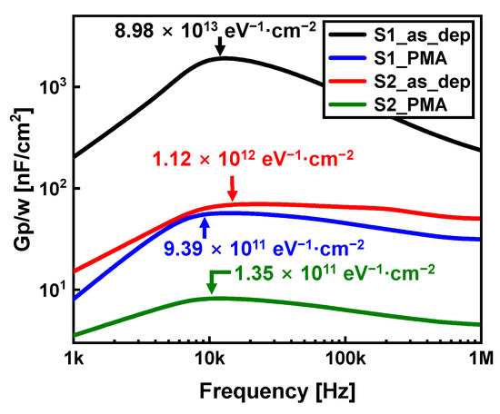 GP/w vs. frequency curves of Al2O3 samples with and without PMA for measuring interface trap density (Dit).