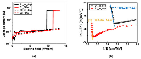 In addition, the FN plots to validate the improvement in the interface quality are shown in Figure 7b. The FN plot is analyzed using the leakage current density caused by FN tunneling, JFN, and can be described as follows: