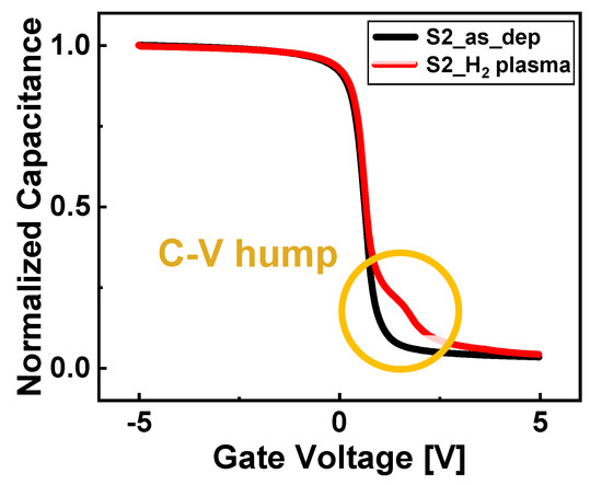 Using the capacitance vs. voltage curve, the plasma damage to the gate stack was confirmed. The normalized capacitance before and after the H2 plasma treatment in the S2 sample with an increased O2 plasma exposure time is shown in Figure 9. In contrast to the S2_as_dep sample, the C–V hump occurs near Vfb in the S2_H2 plasma sample. Therefore, the hydrogen plasma, which should be effused via the reaction with carbon, damaged the Al2O3 dielectric.