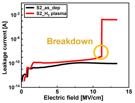 The formation of defects in the oxide and interface regions of the S2 sample owing to the H2 plasma treatment resulted in more leakage flow in the gate stack. In contrast to the S2_as_dep sample, where breakdown does not occur even under the electric field limit of the 4200-SCS equipment (Efield = 14 MV/cm), the breakdown occurs at 11.2 MV/cm in the S2_H2 plasma sample (Figure 10). As a result, in the case of the Al2O3 film with increased O2 plasma exposure time, H2 plasma treatment rather deteriorates the interface quality between Al2O3 dielectric and Si.