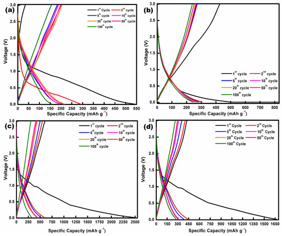 | Mn-Based Anode Materials | Initial Discharge Capacity (mAh g−1) | Discharge Capacity at 2nd Cycle (mAh g−1) | Discharge Capacity after 100 Cycles (mAh g−1) | Reference |