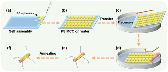 Schematic diagram of template-assisted in situ preparation of ZnO/WO3 nanocomposite porous sensing films. (a,b) A PS monolayer colloidal crystal (MCC) was prepared by interfacial self-assembly. (c–e) The MCC was transferred intact to the precursor surface, followed by another transfer using a ceramic tube substrate. (f) ZnO/WO3 nanocomposite porous films were obtained by heat treatment at 400 °C for 2 h.
