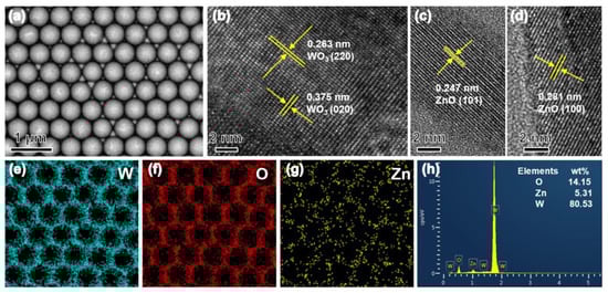 The morphology and crystallinity of the porous films were characterized using transmission electron microscopy (TEM) technologies. Figure 4a shows that the particle size of the large-scale 5% ZnO/WO3 porous film is 500 nm. In the imaging area, the whole porous film is tightly arranged with uniform pore size. Figure 4b–d show the high-resolution TEM (HR-TEM) images of WO3 and ZnO, respectively. The spacing between adjacent fringes is about 0.263 nm and 0.375 nm, which belong to the (220) and (020) crystal planes of WO3, while the spacing between the neighboring fringes is about 0.247 nm and 0.281 nm, belonging to the (101) and the (100) crystal planes of hexagonal ZnO phase. Moreover, based on the energy-dispersive X-ray spectroscopy (EDS) elemental analysis, the O, W, and Zn elements were uniformly dispersed on the surface of the 5% ZnO/WO3 porous film (Figure 4e–g). The EDS result shown in Figure 4h demonstrates that the peaks of O, Zn, and W can be clearly seen in the survey spectrum. The 5% ZnO/WO3 sensor was thus obtained.