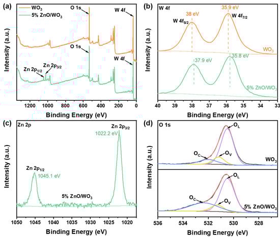 In order to further investigate the elemental composition and chemical states of each element, X-ray photoelectron spectra (XPS) measurements were conducted for the WO3 and 5% ZnO/WO3 sensing films (Figure 5). They reveal that the WO3 film is only composed of two elements, W and O, while the 5% ZnO/WO3 film has an additional Zn element, which was consistent with the previous XRD and EDS results (Figure 5a). The high-resolution spectra of W 4f for both films (Figure 5b) show two distinct peaks located at 37.9 and 35.8 eV, which can be attributed to W 4f5/2 and 4f7/2, respectively, suggesting the presence of W6+ in the film matrixes [33]. In comparison with the W 4f spectrum of WO3, the 4f5/2 and 4f7/2 spin–orbit peaks of 5% ZnO/WO3 shift to lower binding energies of 37.9 and 35.8 eV, indicating that an n–n heterojunction might exist at the interface of ZnO and WO3, and a part of the electrons might transfer. Furthermore, the spectrum of Zn 2p for the 5% ZnO/WO3 film (Figure 5c) specifically shows two strong peaks located at 1045.1 and 1022.2 eV, which correspond to Zn 2p1/2 and 2p3/2 spin–orbit of the Zn2+ chemical state, respectively. Meanwhile, for the high-resolution O 1s spectra, the binding energies at 530.3, 531.3, and 532.4 eV can be ascribed to the lattice oxygen (OL), oxygen vacancy (OV), and chemisorption oxygen (OC), respectively [34]. OL was commonly considered as a non-active oxygen species, which did not participate in the sensing reaction with target molecules, while OV and OC are positively related to the amount of active oxygen species adsorbed on the surfaces. The proportion of varying oxygen species for two sensing materials is displayed in Table 1, which displays that the addition of ZnO increases the content of OV and OC to 43%, thereby providing more potential to improve the gas-sensing performances for the 5% ZnO/WO3 sensors.