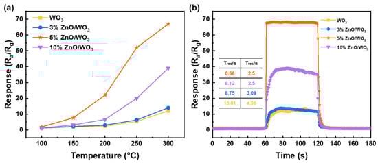 The VOC gas-sensing properties of the four sensors were investigated in detail. Herein, we use toluene as a typical target gas to evaluate the gas-response performances. On account of the importance of working temperature for metal oxide semiconductor gas sensors, we tested the response of sensors at different temperatures to obtain the optimal operation temperature. Figure 6 illustrates the responses of these sensors to 100 ppm toluene vapor in the temperature range of 100–300 °C. The results show that all the responses of these four sensors are the highest at about 300 °C. Even as the sensors’ operating temperatures rise to 300 °C, their response tends to increase. This is consistent with that of traditional n-type semiconductor sensors for reducing gases. However, as continued temperature increase will result in a high energy consumption, which does not meet the actual real-time detection requirements, 300 °C is selected as the optimal operation temperature of those sensors in present work. In addition, the combination of ZnO and WO3 leads to significant enhancement in sensing responses to toluene compared with the pure WO3 sensor in the temperature range of 100 °C to 300 °C. Simultaneously, the 5% ZnO/WO3 sensor demonstrates the best response performance over all temperature ranges, and for excess addition of ZnO (the 10% ZnO/WO3 sensor), the gas-sensitive performances are remarkably decreased [30,35,36]. It can be seen from the XRD pattern (Figure 2) that a new material ZnWO4 appears in the 10% ZnO/WO3 composite system. The formation of ZnWO4 may be the main reason for the decrease of gas sensitivity of 10% ZnO/WO3. The gas sensitivity of the ZnO/WO3 composite system will be improved with the increase of ZnO content, and the gas sensitivity will reach the best when the molar content of ZnO is 5%. From the subsequent gas-sensing enhancement mechanism, we can know that there are n–n heterostructures in the ZnO/WO3 composite system, which will significantly improve the gas-sensing performance. The production of ZnWO4 will break the original best composite system, thus reducing the gas sensitivity of 10% ZnO/WO3. The same change trends can be observed for typical single-cycle response curves of the four sensors at the optimal operating temperature of 300 °C. This emphasizes the significant importance of the appropriate combination of ZnO for WO3 sensors. In addition, a response of Ra/Rg = 68 was obtained for the 5% ZnO/WO3 sensor towards 100 ppm toluene with a response and recovery time of 0.66 s and 2.5 s, respectively. An assessment of sensing performances towards toluene vapor in the literature is overviewed in Table 2, which confirms a significant advance of the as-prepared ZnO/WO3 sensor in present work. The response/recovery times of the ZnO/WO3 sensor for toluene are all less than 3 s, which is much less than that of other toluene-sensing materials [37,38,39]. Such sensitive and fast responses are beneficial to the trace and real-time detection of toxic VOCs for widespread household air quality-monitoring applications.