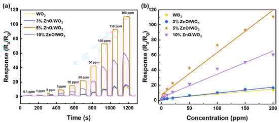 The dynamic response–recovery curves of the four sensors to toluene vapor with stepped concentrations were systematically evaluated at 300 °C, as demonstrated in Figure 7a. Although the responses of all these gas sensors steadily increased with increasing toluene concentration, the 5% ZnO/WO3 sensor displayed the most significant sensitive performance. Despite having the strongest response to the target gas, the 5% ZnO/WO3 sensor showed much smoother fluctuations of the electrical signal at the equilibrium state, revealing a perfect signal stability. Moreover, the composite sensor had a limit of detection (LOD) down to 0.1 ppm, while pure WO3 had an LOD of 10 ppm. Meanwhile, it was difficult for other sensing materials (Table 2) to achieve such a low detection limit. The relationship between the response of the ZnO/WO3 sensor and the concentration of toluene was further studied. As exhibited in Figure 7b, the response values followed an approximately linear increase with the increase of toluene concentration in the range of 0.1−200 ppm, demonstrating that the 5% ZnO/WO3 sensor can work as a toluene vapor sensor in a wide linear range.